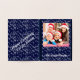 A frente tem uma cena de natividade vintage e o texto PEACE ON EARTH num fundo estrelado em folha. Dentro, a saudação diz "FELIZ TUDO DA SEASON" e a saudação pode ser personalizada por você. Há um lugar para uma foto com o seu nome embaixo em um fundo estrelado azul marinho.