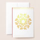 Escolha folha de ouro, prata ou bronze para esta carta elegante. O texto é perfeitamente personalizável para qualquer ocasião especial. A florescente mandala mostra a Magen David, Estrela de David, e está certa de impressionar aquela pessoa especial na sua vida. Mazel Tov!