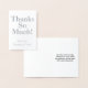 Este design de cartão de obrigado de folha prateada mínima e simples - você recebe a mensagem "Obrigados Tão!" na frente, junto com uma mensagem personalizada no dentro. Pode ser usado para mostrar apreço a alguém que tenha comparecido a um casamento, a um funeral, a uma formatura ou a qualquer outro evento.