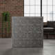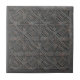 This ceramic tile features a highly textured, repeating geometric pattern that strongly resembles heavy cast-iron utility grating or manhole covers. The design is a complex grid of interlocking lines, combining diagonal squares and symmetrical crosses with prominent, raised, rounded rectangular (or capsule) elements. The deep relief and structured layout give the surface a rugged, mechanical, and highly tactile appearance. This dramatic tile is perfect for creating a bold, masculine statement and is ideally suited for Steampunk, industrial-loft, urban, or modern-Gothic décor applications like backsplashes, accent walls, and fireplaces. Search ID1227 to see other metallic geometric designs in this series. Note: design adapted from generative content.