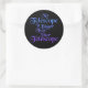 Um pequeno humor de geek científico, adesivo preto com "Meu Telescópio É Maior Que Seu Telescópio" em escrita azul e violeta.