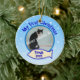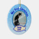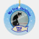 Este ornamento personalizado do gato da imagem tem a sala para a foto feita sob encomenda do seu animal de estimação. Acima dele diz, "meu primeiro Natal." Abaixo dele tem um peixe com espaço por seu nome e o ano de animal de estimação.