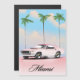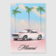 Poster de viagens do Sol Rosa Miami, apresentando um carro muscular retrô-americano contra o pôr do sol da noite.