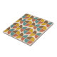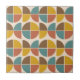 This is elegant ceramic tile featuring mid century semi circles and abstract shapes in mustard yellow, teal, burnt orange and brown on biege background.