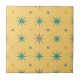 Capture the joyful energy of 1950s-60s atomic age design with this vibrant retro starburst pattern. Bold turquoise starbursts explode across a warm golden-yellow background, accented by playful polka dots in sunny orange and cool charcoal gray. The crisp geometric shapes, optimistic color palette, and dynamic repeating motif create a cheerful, nostalgic, mid-century modern vibe perfect for adding playful vintage flair to any space.