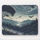 Escape into the quiet solitude of the "Midnight Valley." This atmospheric illustration features a dramatic mountain landscape rendered in deep slate and charcoal tones. With a winding river, dense evergreen forests, and birds soaring beneath a unique textured sky, this piece evokes the stillness of the wilderness at twilight. Its sophisticated, dark aesthetic makes it a perfect focal point for a modern living room, a quiet study, or a rustic cabin retreat.