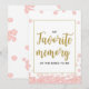 Este sinal de chá de panela moderno com "Minha memória favorita da noiva" apresenta um fundo floral rosa com respingos de glitter dourado. O texto é escrito em uma mistura de uma fonte de caligrafia divertida e uma fonte sans moderna. Cartões personalizados de memória favorita da noiva estão disponíveis.