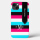 Este gabinete personalizado preto, branco, azul-turquesa e malhado cor-de-rosa fuchsia Mal Ali Mini Retina tem um padrão de fundo listrado em negrito grande e uma faixa preta com costura branca que você pode adicionar seu nome, iniciais, monograma ou outro texto. Este novo caso moderno e moderno faz uma declaração chic para o jovem motista da quadra! Se precisar de assistência, envie um email para niteowlstudio@gmail.com.