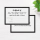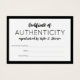 Um pequeno cartão de autenticidade em preto e branco ao qual você pode adicionar seu nome ou nome comercial a dentro de uma borda negra espessa.