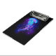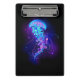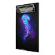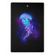 Água-viva grande, azul, desenhada artisticamente, brilhante, brilhante, com longos tentáculos sobre fundo preto com bioluminescência roxa. Água-viva luminosa.