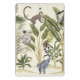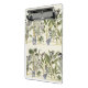Uma prancheta com um padrão de selva que apresenta lêmures, macacos e preguiças entre plantas tropicais, reproduzida em um estilo detalhado e ilustrativo com uma paleta de cores muda.