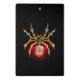 Aranha mecânica, com pá-pá de ouro, engrenagens de latão e uma lâmpada de vidro vermelha sobre fundo preto. Estilo Steampunk.