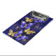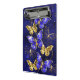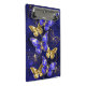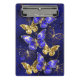 Composição de borboletas luxuosas de safira e joias de ouro em fundo azul texturizado.