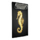 Artista, polígono, cavalo marinho espumante, folha de ouro sobre fundo negro.