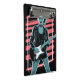 Uma ilustração vetorial dinâmica e de alto contraste de uma feroz e elegante estrela do rock ou guitarrista feminina. A mulher é retratada com um penteado moicano/pontas espetadas, uma gargantilha com rebites, um clássico casaco de couro e meias de rede. Ela está confiante, segurando uma guitarra elétrica. O gráfico usa uma paleta de cores estilizada e limitada, apresentando tons de ciano/teal frios para a pele e as roupas, contrastados com listras vermelhas/rosas em negrito no fundo e uma moldura retangular rosa neon.