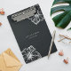 A área de transferência personalizada chic da ilha apresenta duas linhas de texto personalizado em caracteres brancos clássicos, sobre um fundo preto macio adornado com uma ilustração floral de hibisco tropical em folha de prata falsa. O lado inverso mostra uma variação no design com uma flor menor e seu texto personalizado. Observe que esta área de transferência é um tamanho mini; a versão do tamanho do cheio também está disponível em nossa coleção Hibiscus.