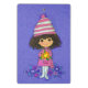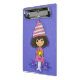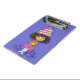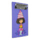 Esta miniprancheta tem uma imagem vintage de uma adorável garotinha vestida de roupa rosa com um chapéu branco e rosa segurando uma margarida laranja e amarela. ela está vestindo botas brancas altas com flores bonito em seus pés num fundo de púrpuras e pinks misturados.