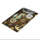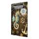 Fundo de madeira castanho com fundo marinho, cordilheira mecânica, volante antigo, âncora de ouro e diversas engrenagens de ouro e latão. Estilo Steampunk.
