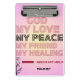 “God — My Love • My Peace • My Friend • My Healing” and highlights Psalm 28:7 beneath a minimalist rose. Lightweight yet sturdy hardboard resists daily wear; the low-profile metal clip grips index cards, receipts, or half-sheet print-outs. Slip it into a purse, Bible cover, or teacher tote for on-the-go inspiration. Perfect for students, Bible study leaders, nurses, and busy moms, teachers, restaurant servers, and office workers who need God’s help at hand.