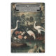 pintura botânica vintage de guindastes em pé num lago cercado por lindas flores exóticas com palácio ao fundo