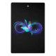 Símbolo infinito com borboleta mágica, roxa e brilhante com asas transparentes, sobre fundo preto. Borboleta brilhante.