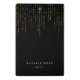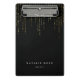 A área de transferência dinâmica apresenta duas linhas de texto personalizado em letras brancas clássicas em um plano de fundo preto rico, com linhas verticais de linhas de carateres de folha de ouro falsas em cascata a partir do topo. Design repete-se no lado oposto. Observe que esta área de transferência é um tamanho mini; a versão do tamanho do cheio também está disponível em nossa coleção Marquee Dourada.
