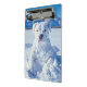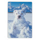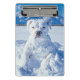 Foto de um cachorrinho fofo coberto de neve, parecendo um cachorrinho. "Saudações Snowy do nosso 'Pitt-snow-bull'! Desejando-lhe um Natal pejorativo e divertido!"