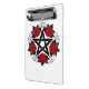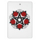 Pentagrama preto com padrão, decorado com floração, rosas vermelhas com folhas em fundo branco. Tatuagem.