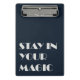Organize your tasks with a touch of inspiration. This sleek office clipboard features a deep navy blue finish with the empowering 'STAY IN YOUR MAGIC' quote in bold, modern typography. Made for professionals, students, and coaches who appreciate minimalist aesthetics, it’s not just a tool—it’s a statement piece. Durable and stylish, it keeps your documents secure while adding a sophisticated vibe to your workspace. Perfect for meetings, clinical rounds, or daily errands.