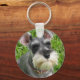 Cachorro de Miniatura Schnauzer sentado na chaveiro de grama.