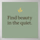 The “Find Beauty in the Quiet” poster by Auréline Studio captures the art of slow living and mindful simplicity. Designed in soothing sage green with elegant serif typography, this minimalist wall art adds calm, balance, and timeless beauty to your home or workspace.