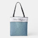 Esta bolsa de tote é mostrada com um impressão brilhante Dusty Aqua Blue. Tem uma banda Azul Aqua Dusta Claro no topo com seu título personalizado, nome ou frase favorita. Tamanho médio mostrado. Tem pulseiras negras. Personalize este item ou comprar conforme projetado.