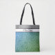 Esta bolsa de tote é mostrada com um impressão de brilho azul Aqua Azul Azul para Verde do Mar. Tem uma banda falsa de brilho prata no topo com seu título, nome ou frase favorita personalizado. Tamanho médio mostrado. Tem pulseiras negras. Personalize este item ou comprar conforme projetado.