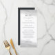 Chic and elegant black and white wedding menu features eight editable text fields with your names and wedding date on the top, accented by sheer watercolor washes of pale gray. Designed to coordinate with our Mist wedding collection. Use the template fields to add your menu information, and then click "Customize" to reposition elements if needed.
