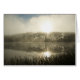 Mist no lago e raios solares através das árvores