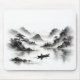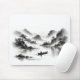 A mousepad featuring a lake against misty mountains.
