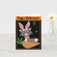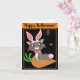 Misty é um gato de desenho animado de cinza em um adorável vestido de coelho rosa, cheio de orelhas de coelho e rabo. Ela está sentada sobre uma almofada de cenoura que é colocada em frente a uma casa assombrada escura com algumas luzes, e uma coruja marrom está empolgada nela. Truque ou Tratar! O fundo pode ser qualquer cor.