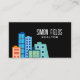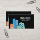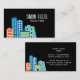 Modelo de cartão de negócios de aluguel imobiliário da cidade. Cartão de visita moderno com desenhos coloridos de prédios de horizonte urbano. Excelente para o mercado de aluguel, arquiteto, construtores, agentes imobiliários, corretores, agências de sublocação, moradias de expatriados, compartilhamento de escritórios, áreas de trabalho, comércio e muito mais.