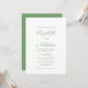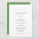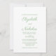 a design da frente mostra um convite de casamento escrito em caligrafia clássica verde de sábio e tipografia com fundo branco. a design é perfeita para o tema elegante, clássico, único e moderno do casamento.