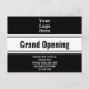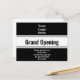 No topo, há uma imagem de exibição que você pode substituir pelo logotipo de sua empresa. No centro, há texto de exibição em preto para uma mensagem personalizada (mostrada: Grande Abertura). Na parte inferior, há linhas de texto de exibição que você pode editar para compartilhar a data e o endereço. O cartão-postal é preto e branco.