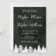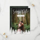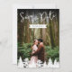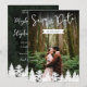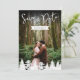 Um cartão de "save the date" de dois lados com a sua própria foto na frente com as palavras "Save the Date" e a data do casamento personalizável exibida sobre uma forma simples de fita branca. O verso mostra uma foto da paisagem da floresta por Destei com espaço para detalhes adicionais do casamento. Uma fileira de silhuetas de abetos reveste a parte inferior, adicionando um toque da floresta. Perfeito para casamentos de caminhada, celebrações ao ar livre e eventos inspirados na natureza, este cartão elegante combina momentos pessoais com a beleza cênica.