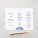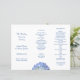 Programa de casamento triplo em branco com texto azul e um desenho de flor de hortênsia azul. Dobre em terços após a compra para criar três páginas com título, nomes, data e local do serviço na frente. A seção do meio contém as informações da cerimônia com o lado direito para listar a festa de casamento, nota pessoal para os convidados, em memória de, ou o que você desejar. Uma imagem de hortênsia azul claro está na parte inferior da seção do meio.