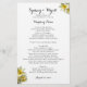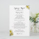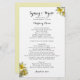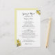 Modelo de cardápio floral com flores de plumeria. Flores brancas e amarelas decoram os cantos do papel branco com modelos de texto preto. Incluir nomes da noiva e do noivo, local do evento, título do menu e data. Todos os itens de comida e menu são adicionados em um parágrafo. Use espaços conforme necessário para preencher a área. O jornal é barato para um casamento casual, ou transfira o design para um papel melhor, como quiser.