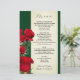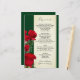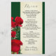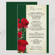 modelo de menu do Rosa vermelha para uma recepção de casamento, almofada de chá de panela ou outro evento grande. Papel verde escuro, com painel de tons de sépia para texto e flores de rosa realísticas e botões decorando a borda. O reverso é verde estável. Texto "Menu" na parte superior com nomes e data na parte inferior. As seleções de menus são adicionadas em um parágrafo usando espaços, conforme necessário.