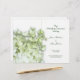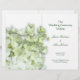 Modelo do programa de casamento verde-claro e branco. Pequenas pétalas realistas da flor da hydrangea de Limelight decoram ambos os lados deste programa personalizado. Adicione seu próprio texto verde-escuro nos modelos fornecidos. Dobrar ao meio após a compra. **Para obter melhores resultados, não altere o tipo de papel.