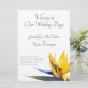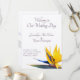 Modelo de um programa de casamento plano de pássaro do paraíso para uma pequena cerimônia íntima. Em papel de feltro melhorado, este bonito papel de carta floral é impresso em ambos os lados. Para reduzir o preço, escolha um papel básico! Uma grande flor tropical do paraíso em amarelo brilhante decora a frente. O texto roxo escuro é fácil de personalizar com um título, nomes do casal, data e local da cerimônia. No verso estão incluídos a ordem da cerimônia e os nomes do oficial, músico, festa de casamento e familiares, como você escolher. Esta placa simples tem um tamanho 6x8 maior ou escolha outra. Faz uma maravilhosa manutenção desse dia especial.