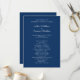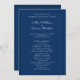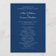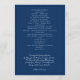 Modelo do programa de casamento simples e azul marinho com texto branco em ambos os lados das placas planas. O design de amostra tamanho 5x7 ajustado em alguns outros tamanhos. Essas placas também têm upgrades opcionais de papel. O texto impresso e as fontes de script manuscritas são fáceis de personalizar usando as seções modelo. Um conjunto fino de linhas faz uma borda ao redor da borda das placas para enquadrar o texto. Personalize o título do programa, inclua a data e a hora do evento, a ordem da cerimônia e liste a festa de casamento. Um modelo no verso pode ser usado pelo casal para escrever uma mensagem pessoal para os convidados. Ou use o espaço para mencionar parentes que não estão mais vivos, mas presentes em corações. Este simples design de programa que funciona para muitos tipos de cerimônias de casamento.