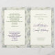 O programa de casamento dobrado com o desenho floral e a longa cerimônia da igreja modelo. As flores de hydrangea multicoloridas com folhas fazem um padrão de fundo de um lado. Quando dobradas, essas páginas serão a frente e o verso do programa. As cores são verdes claras e lavandas. O script moderno é usado em roxo para os nomes dos casais sobre um grande e grande computador. No verso do jornal estão incluídas as informações da cerimônia à esquerda e a lista de participantes à direita. Todo o texto é um exemplo e não uma verdadeira ordem de cerimônia! Altere o texto conforme necessário e adicione/remova o espaçamento ao texto do ajustado. Se sua cerimônia será muito mais simples, talvez faça o texto um pouco maior, ou como eu para ajudar.