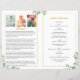Programa funerário verde e dourado com folhagem de aquarela e ouro. Fácil de editar e personalizar, este modelo tem uma colagem de fotos na página traseira com espaço para 9 fotos. As páginas de dentro têm um exemplo de obituário e ordem de serviço, mas elas podem ser substituídas por mais fotos ou seu próprio texto, como poemas, letras de música ou leitura. Este programa funerário impressão de dois lados em uma folha de solteiro de papel Carta (8,5 x 11 polegadas). Quando dobrado, isso cria um livreto com 4 páginas de metade do tamanho da letra (8,5 x 5,5 polegadas por página).