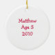 A parte traseira do ornamento diz, "Matthew, idade 2, 2010." Você pode substituir esse fraseio da amostra no modelo com sua própria mensagem, ou suprima d para deixar o vazio traseiro.